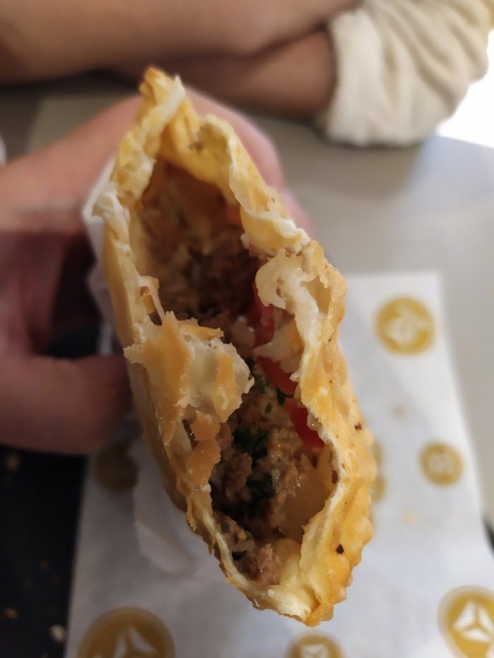 O pastel não é grande de tamanho, mas é bem recheado; só reclamaria quem gosta de massa e recheio de vento.