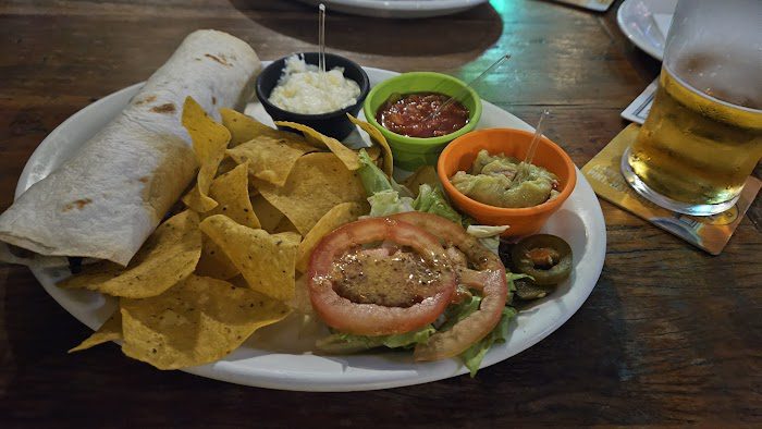 Das comidas que prometeram eu não vi metade… Passaram duas vezes pra deixar meia dúzia de nachos com uma merreca de chilli e guacamole. Depois deram um mini hambúrguer com batata e não passaram mais nada.