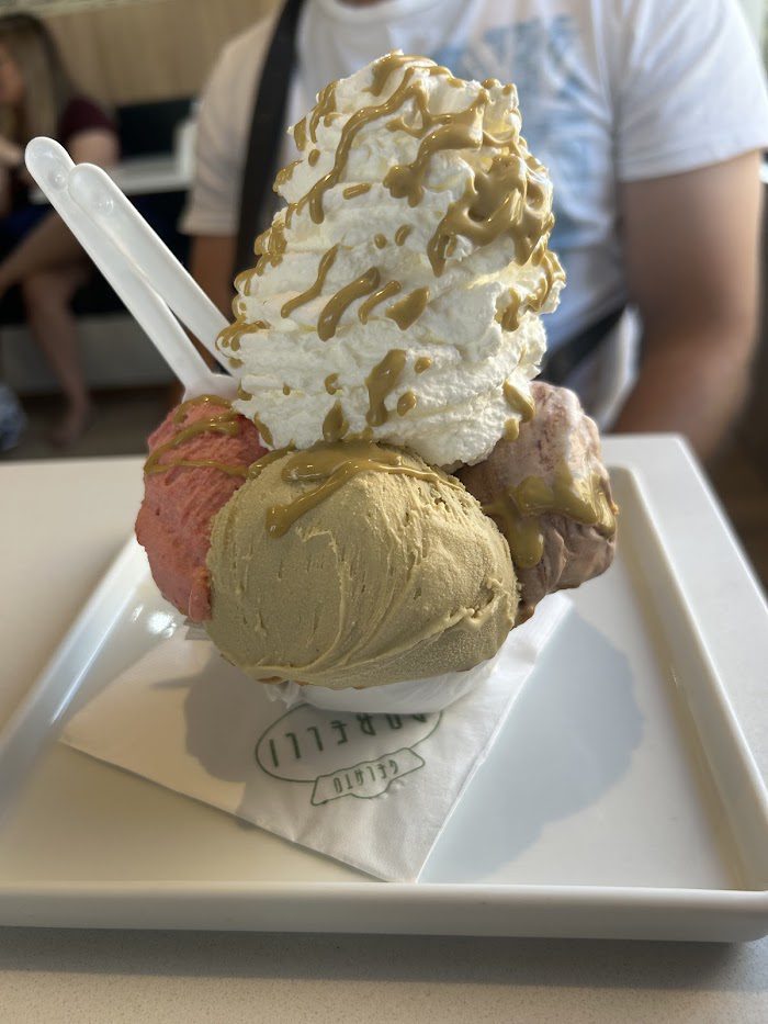 Geralmente opto pelo cascão com 2 sabores de gelato e recheio de creme de pistache.