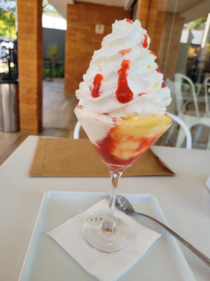 Um espetáculo de lugar, começa pelo aroma perfeito de casquinhas de sorvete sendo preparadas na hora! O mesmo sai por 27$ com direito a dois sabores e um recheio na casquinha.