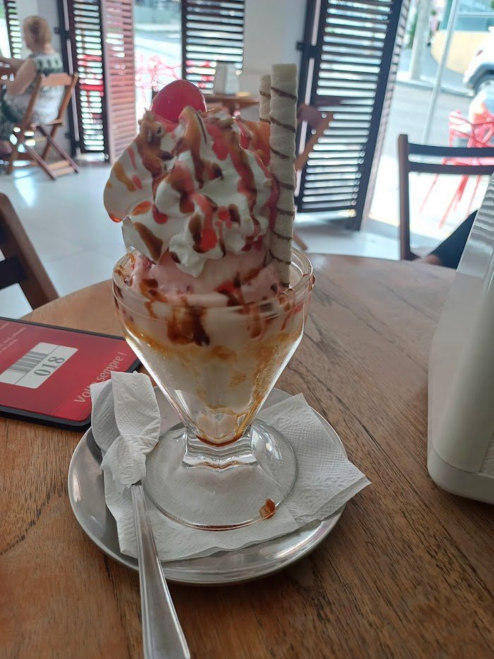 Fui uma segunda vez e resolvi experimentar o sunday de 3o,oo. Fiquei bem decpecionada pela apresentação e pouca calda e castanha além da “cereja” não ser cereja de verdade, mas estava gostoso.