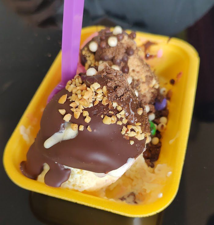 Sorvete muito saboroso, bem suave. Chama atendente, demora a responder, ficam olhando para o nada. Estacionamento, são 4 vagas na porta e se tiver sorte acha vaga, mas nada que seja ruim. Cobertura quente, é chocolate hidrogenado, então fica ruim quando vamos comer. O fini de amora estava tão duro, que precisei chupar. Nenhuma calda fica tampada e nem os fini. Coberturas todas destampadas. Fruta: peguei morango, muito verde, duro….acho que precisa melhorar essas coisas. Mais simpatia dos funcionários, mais cuidado com os produtos.