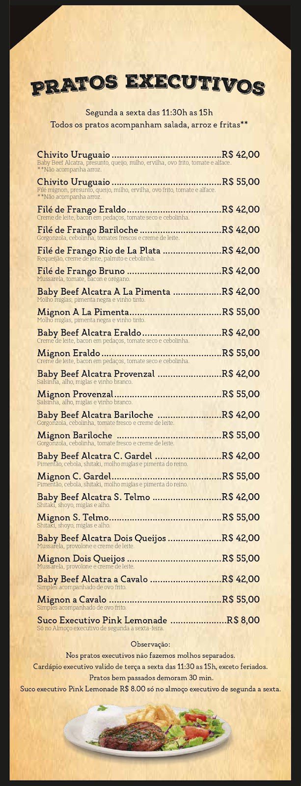 A comida é muito boa, carne no ponto certo e acompanhamentos muito bom, exceto a batata frita, um prato de R$; 175,00 vir com batata frita congelada não é legal, acredito que pelo nível do restaurante e pelo valor cobrado deveria ser batata cortada na casa e não congelada igual a todos restaurante básicos.